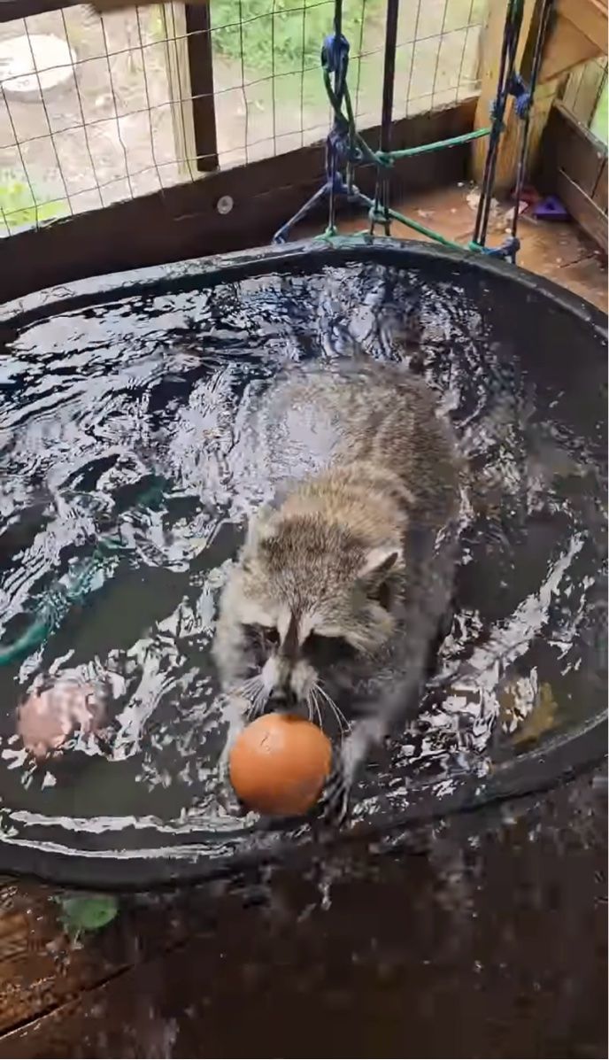 バスタイムを満喫するアライグマのミランダ。 ほっこりするその愛らしい姿は、こちらの動画からご覧いただけます。