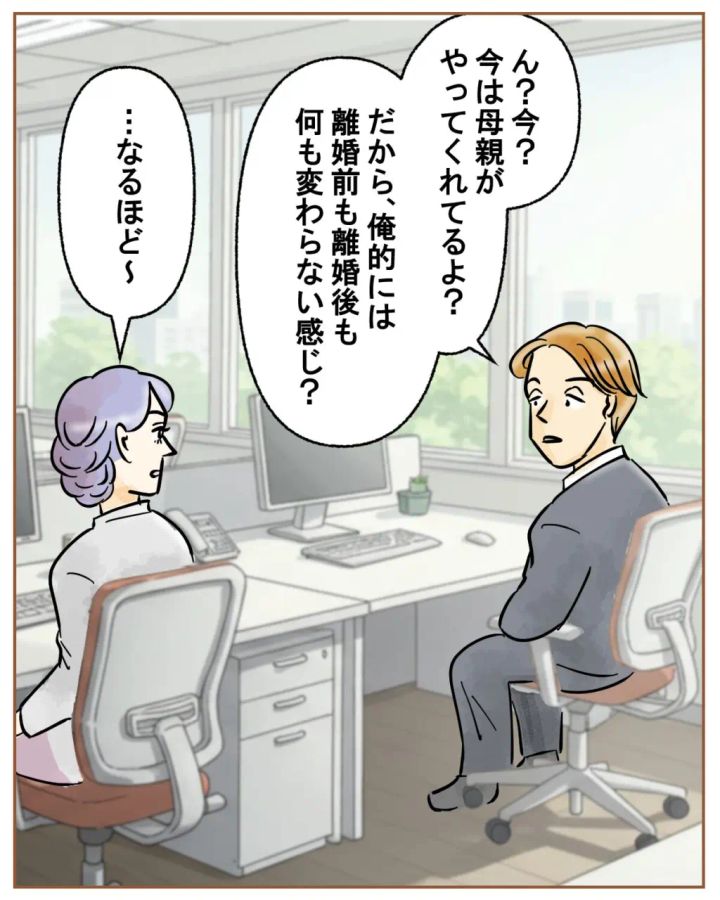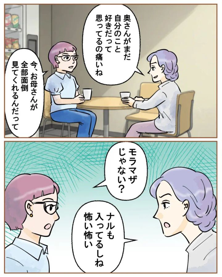 「奥さんがまだ自分のこと好きだって思ってるの痛いね」女性社員同士でお茶を飲みながら話しているのはツカサさんの離婚のこと。「今、お母さんが全部面倒見てくれてるんだって。モラマザじゃない?」と言うと、「ナルも入ってるしね。怖い怖い」と言い合いました。
