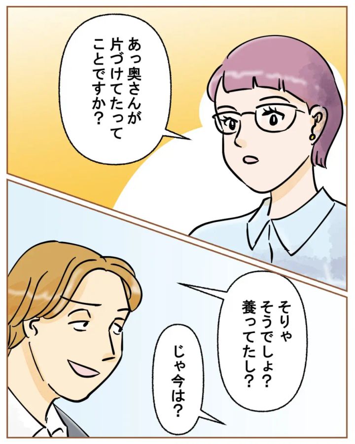 離婚してから数か月後のこと。会社で離婚について聞かれたツカサさんは、「向こうは離婚したくないって言ってたんだけどさ」とありもしないことを言い出し、価値観の違いについてたずねられると、飲みかけのペットボトルや脱いだ靴下を片づけるのは気づいた方がやればいいと持論を展開。もう一人の女性社員も話に加わり、「奥さんが片付けなかったってことですか?」と聞かれ、「え?違うよ?」と即答するツカサさんに、「あっ、奥さんが片付けてたってことですか?」とたずねると、「そりゃそうでしょ?養ってたし?」と平然と答えるツカサさんに、「じゃ今は?」と聞くと、