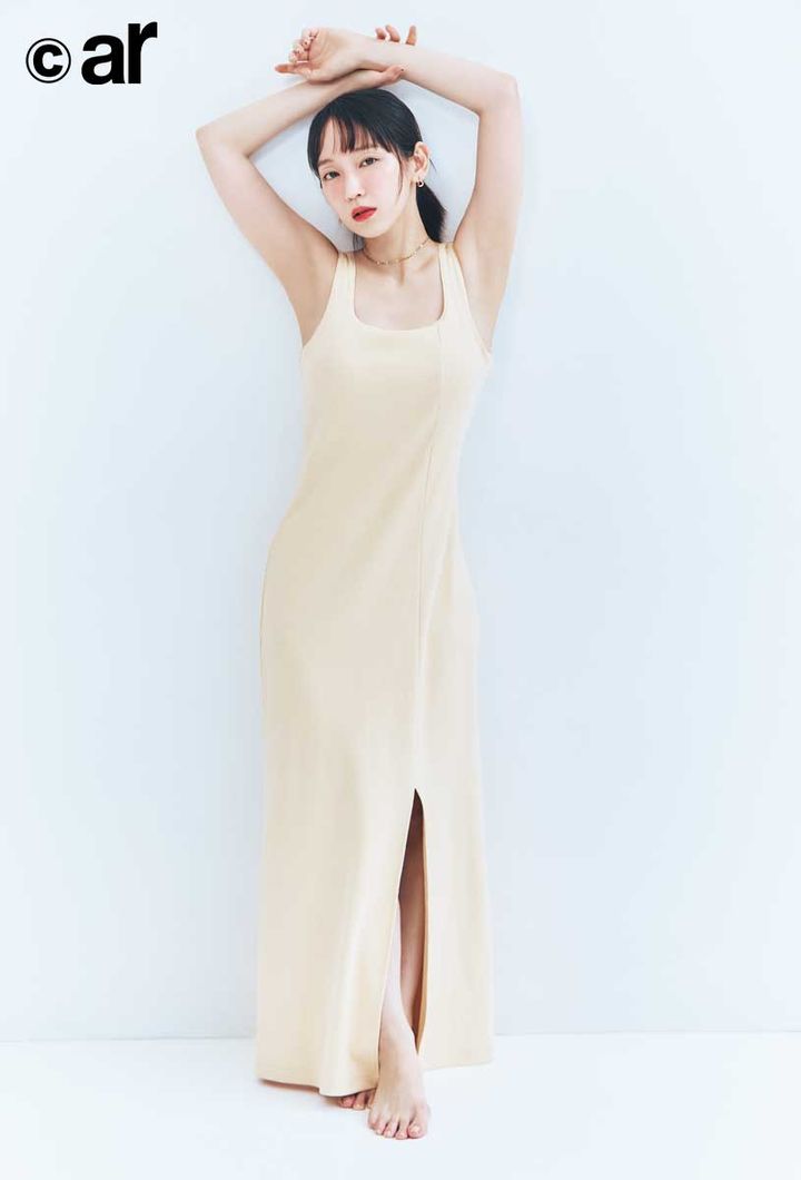 吉岡里帆。ar9月号より ワンピース¥11,880/シールームリン(シールームリン神宮前店) ピアス¥4,180/イエルズ、ネックレス¥4,000/クロレココ(ロードス)