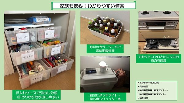 また、ローリングストックをしているペットボトル飲料の賞味期限管理や、寝室に配置した防災用品の収納法などにも工夫が光り、高得点を得ました。