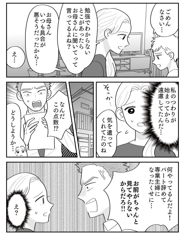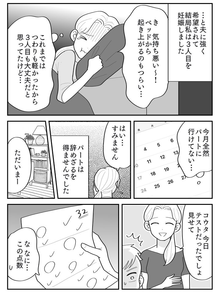 お腹が大きくなってきても体調不良はまったく終わらず、私はほとんど横になっているような状態。料理や洗濯など最低限の家事をこなすのが精いっぱいの日々です。すると臨月を控えたある日、コウタが学校のテストでひどい点数を取ってしまったことが判明しました。