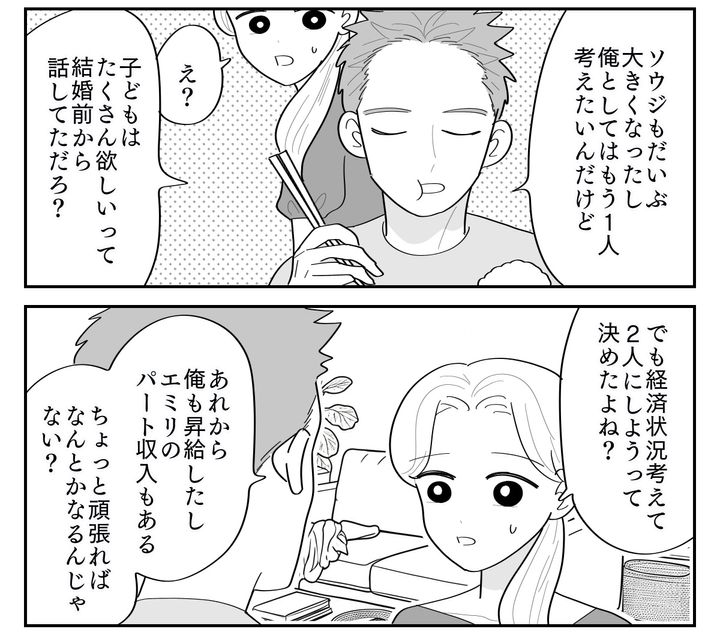 経済的なことを考え、子どもは2人と決めていた私たち。けれどそのときに比べたら世帯収入も上がっています。「ちょっと頑張れば無理な話じゃないよ。なんとかなるんじゃないかな」ヒロトにそう言われ、私は強く反対できませんでした。