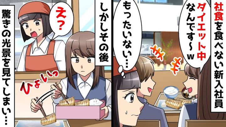 ところがあるとき、気がかりな存在が現れました。それは新卒で入ってきたA子という名前の女性。彼女は同僚たちと食堂にきて食事を注文するものの、少し食べると手を止めてしまうのです。同僚たちが「体調でも悪いの?」と心配すると、「ダイエット中なので、ゆっくり食べてるんです」などと言っており……。