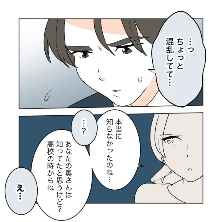正直に「混乱している」と言ったワタルの様子を見て、「本当に知らなかったのね」とサクラは言いました。そして「あなたの奥さんは知ってたと思うけど?高校の時からね。」とピシャリ。思わず「え・・・」と言ってしまったワタルです。