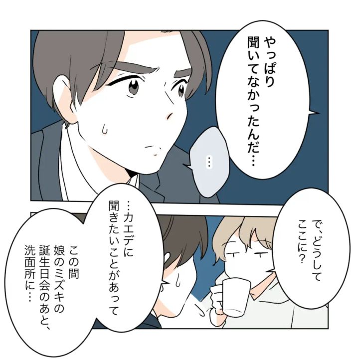高校の同級生だったシズクと結婚したワタル。娘ミズキの誕生日に呼んだアカネと一緒に、カエデも訪問してきました。シズクがうっかり手を滑らせてジュースをこぼし、カエデの娘アカネの服を汚したため、ミズキの服を借りたアカネが洗面所で着替えた時にカエデも一緒にいたのをワタルは知っていました。そのため、誕生日会の後に洗面所の観葉植物の土が洗濯機の中にばらまかれているのを見つけたシズクが動揺しているところを見て、シズクのためにもカエデに確認しようと思いカエデの自宅へ。アポなしなのもあり、帰ろうか迷っていたところにショウマが来てカエデの家にいた奥さんのサクラを紹介したため、ワタルは初めてショウタが高校からサクラと付き合っていて、今は結婚していることを知ったのです。