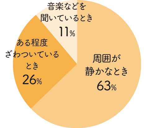 ▶静か過ぎは苦手。図書館学習室は使わず、公共施設の学習室をたまに使う。適度に人の気配と日常会話が聞こえていたり、自宅でも音楽を流しているほうが集中できる。TVは観てしまうので書類作成、仕事中は駄目(I・K/接客・販売)