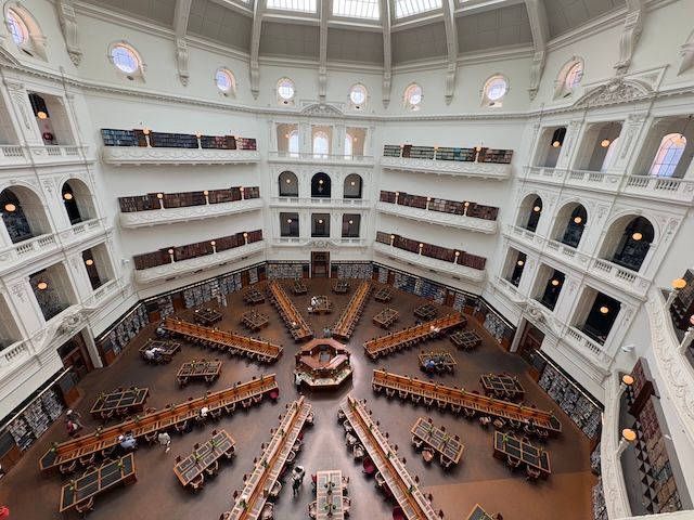 図書館は誰でも無料で入館可能なので、読書をする人、調べ物をする人、写真を撮る人が同じ空間を静かに共有しています。この「静けさをともにする文化」こそが、メルボルンという街の魅力を象徴しているように感じます。