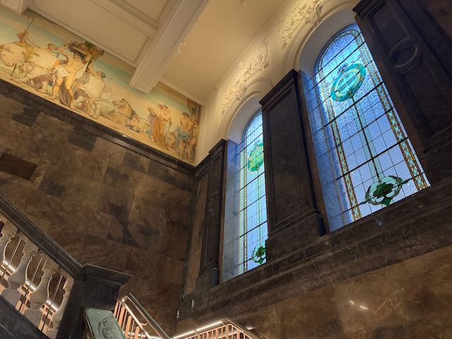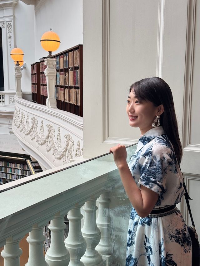 内観も素晴らしいのですが、図書館の正面も必見です。1854年に建てられた重厚なファサードは、まるで歴史あるヨーロッパの宮殿のよう。荘厳な石造りの外壁と広々とした階段が印象的で、観光客だけでなく地元の学生たちもここで集い、昼下がりを楽しんでいます。