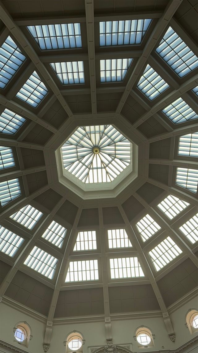 高くそびえるドーム型の天井から光が差し込み、最上階の回廊から見下ろす構図が世界で最も美しいと言われる所以。シンメトリーを意識して中央に収めれば、まるで絵画のような一枚が完成します。広角レンズやスマートフォンのパノラマ機能も活躍します。