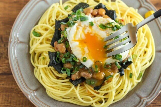冷蔵庫にあるもので簡単にできるお手軽パスタ。ポーチドエッグを崩しながら、納豆も混ぜ合わせて食べると、ポーチドエッグの塩気や卵のコクが絡んで最高です!