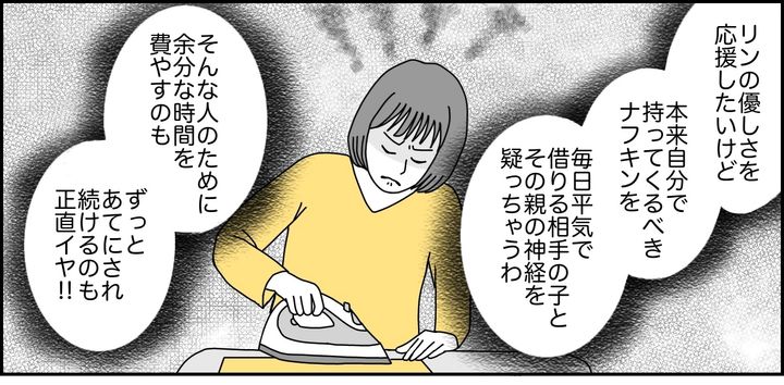 私はカエデ(30)。リン(小1)と2歳の娘を育てています。私は正社員の時短で働いていて、夫は激務なので家事や子育ては私の役割。忙しい合間をぬってリンが給食の時間に使うナフキンにアイロンをかけているのですが……。最近リンは隣の席のハナカちゃんがナフキンを忘れるので、毎日貸しています。リンは何かあったときのために予備を持ちたいタイプ。ナフキンにアイロンをかけられない日を想定して、多めにアイロンをかけているのに、毎日ハナカちゃんに貸すことによって手間が増えてしまいました。