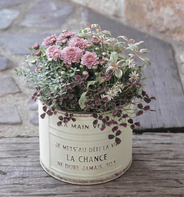 サイズもカラーリングもキュートな秋の寄せ植えです。ガーデンマムのやさしいピンクに合わせて、斑の色もマッチしている名脇役のリシマキア ‘トワイライト’ を。足元のクローバーは渋めの色で全体を引き締めてくれています。