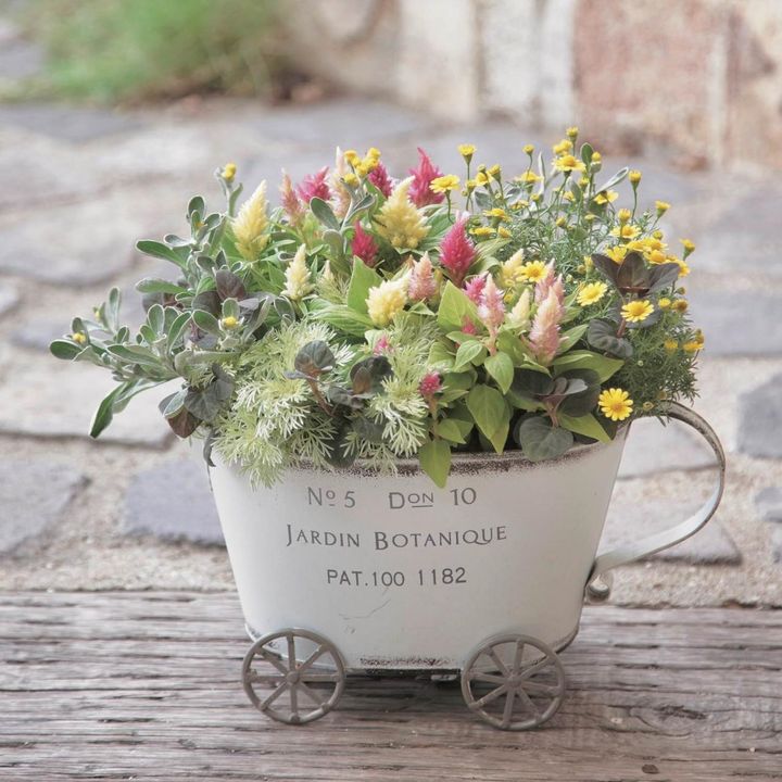 季節を問わず人気の乗り物型のブリキ鉢。かわいい車で秋を運んできてもらいました。ピンク、黄色、緑と色とりどりなのに、どこかやさしい雰囲気を感じるのは、色の淡さをそろえたことと、花も鉢も小ぶりだから。器が小さいときは、花も小さなものを選ぶことがまとまりよく仕上がるコツです。
