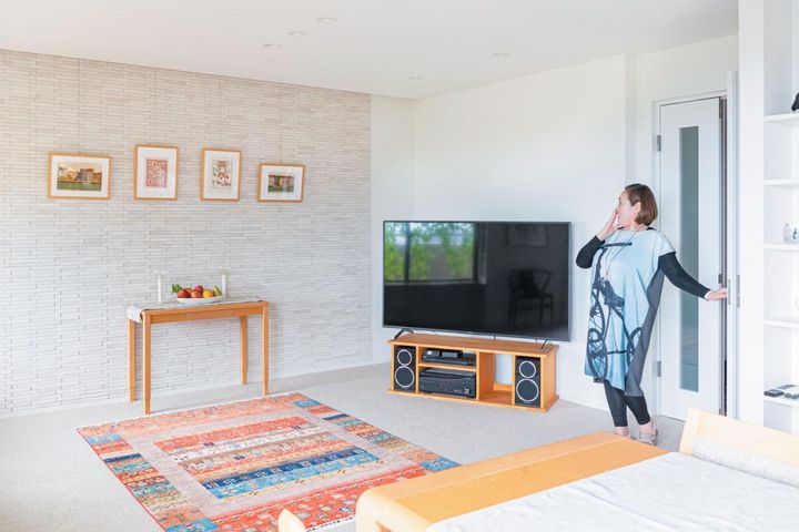 テーブルとテレビ以外は大きな家具がない広々としたリビングルーム。キッチンカウンターにもモノがない。檜垣文子さんの自宅は、まさにすっきり快適な空間だ。