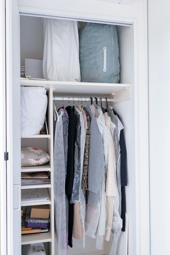 「かける収納が一番ラクなので、トップスやボトムスなどかけられるものはパイプハンガーに。オンシーズンのものをアイテムごとに分けてかければ、コーディネートもしやすくなります」。写真のクローゼットにはコートやワンピースなど丈の長いものを。