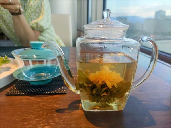 茶葉の上に愛らしく咲く黄色い金盞花から、すくっと真っ直ぐ立ち上げるジャスミンの白く可憐な様子が、天から現れた仙女の姿を思わせ、飲みやすく、お食事とも相性が良いお茶です。是非、ホテルでいただく優雅な中華コースと併せて楽しんでいただきたいです。