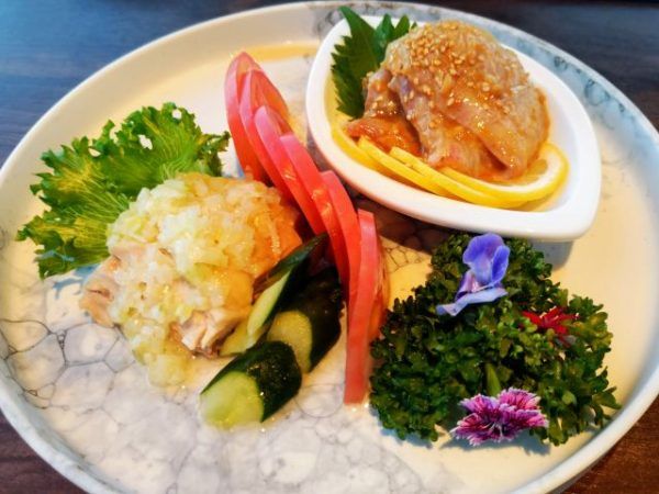 先ずは、前菜から。「蒸し鶏の葱ソース」と「鯛の胡麻和え」の2種盛りです。ビジュアルもサイコー!美しいです。