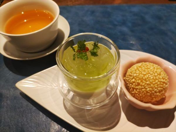 シャインマスカットがのった冷製杏仁と、香ばしい香りがふわっと広がる胡麻団子。中華の余韻をゆっくりと楽しめるひと皿でした。