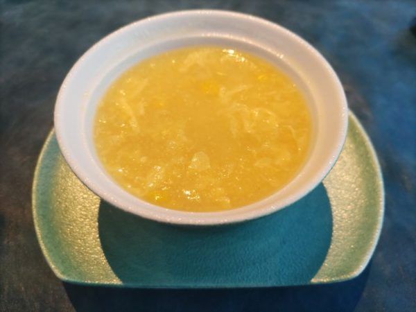 スープは、「コーンスープ」です。とっても甘いコーンの旨味と、とろーり卵で、ほっこりするお味。