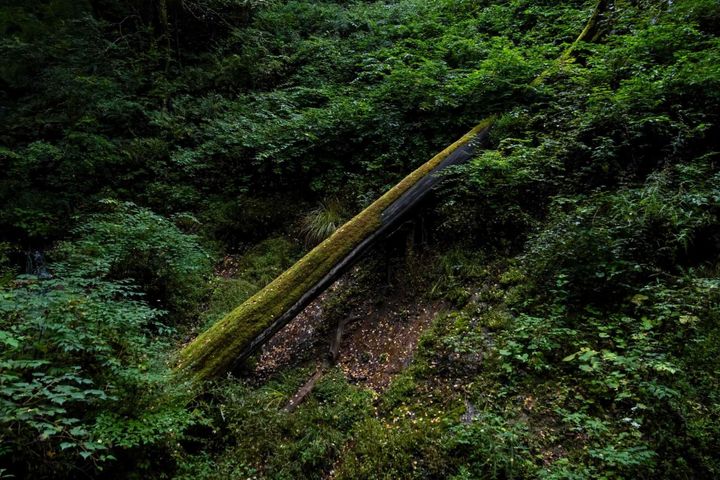 まず最初の目的地は、白糸の滝。約70mにもわたって、無数の細い滝が水のカーテンのような景色が有名です。しかし、私のお気に入りは、メインスポットの少し手前にある、大木が倒れているスポット。
