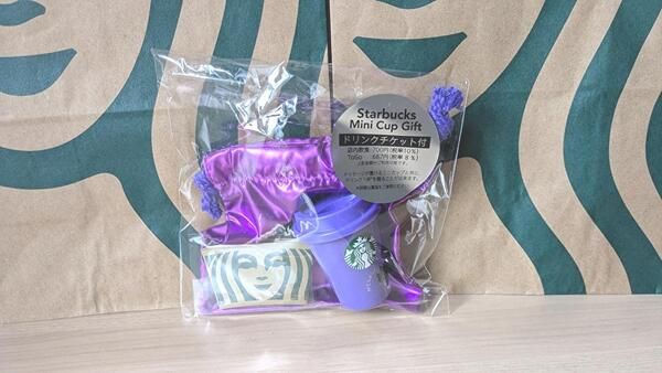 ドリンクチケットとメッセージが書けるスリーブがついたハロウィン仕様のミニカップギフト。鮮やかなパープルの巾着はちょっとした小物入れにも便利です。