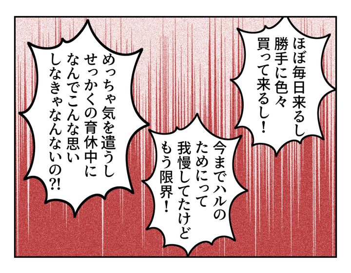 おぉ……。リホさん、ついに旦那さんに素直な感情をぶちまけたのですね。「アポ無し」「ほぼ毎日来る」「勝手に物を買ってくる」「めっちゃ気を遣う」「育休中なのに」などなど……。リホさんの口からは次から次へと我慢していた思いがあふれ出てきます。そして「ママ呼びも嫌」と伝えたリホさん。ビックリしている旦那さんは、平日の昼間にやってくるお義母さんのふるまいをきちんと把握していなかったのかもしれませんね。
