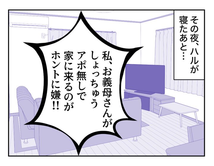 リホさんは現在育休中。生後半年のハルちゃんとゆったり過ごせる貴重な日々です。しかし徒歩圏内に暮らすお義母さんにしょっちゅうアポ無しで訪問されてゲッソリ。しかもお義母さんに「ママ」と呼ばれるようになりイライラ……。リホさんが児童館でグチると、呼び方の問題ではなく義母との関係性の問題だと言われました。リホさんは我慢しきれなくなった自分の気持ちを夫にぶつけることにしました。