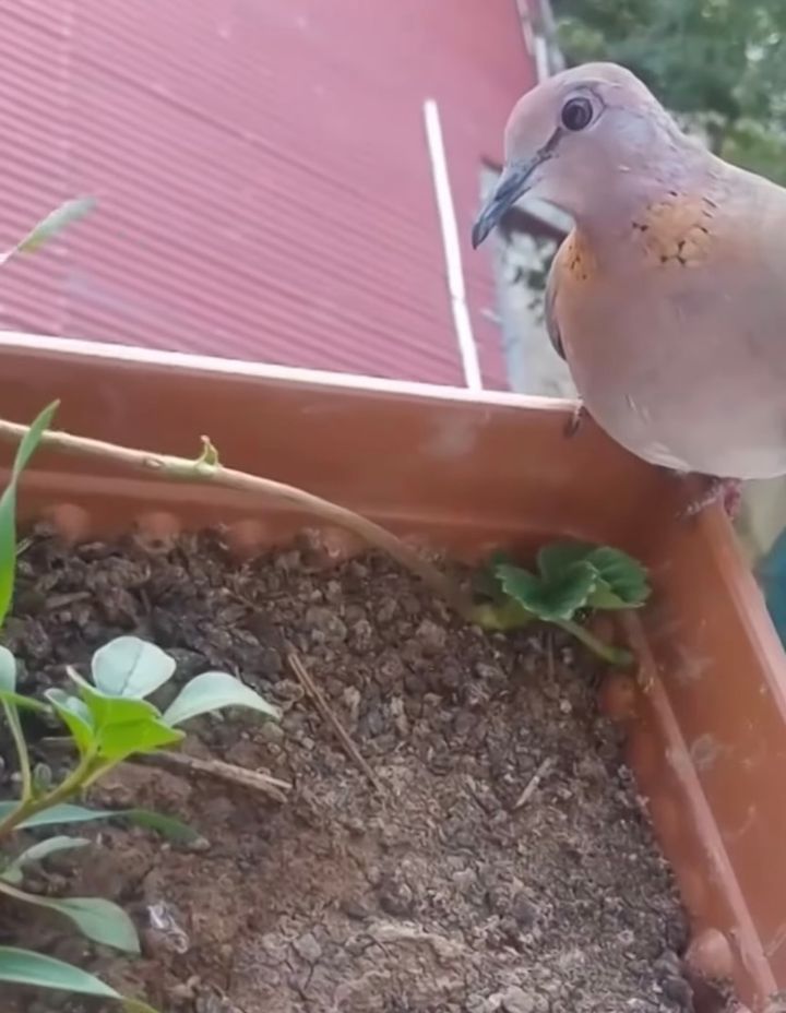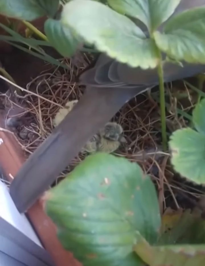 声をかけてもじっとして動かない鳩を見た男性は、プランターの中を見回します。 するとそこには・・、愛らしいサプライズが隠されていました。