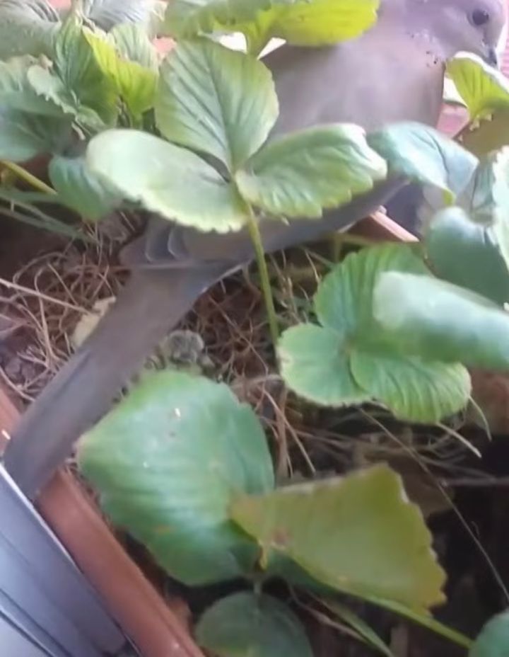 3. イチゴのプランターに鳩がとまっている!そのプランターの中をよく見るとそこにはかわいいサプライズがありました!!【海外・動画】