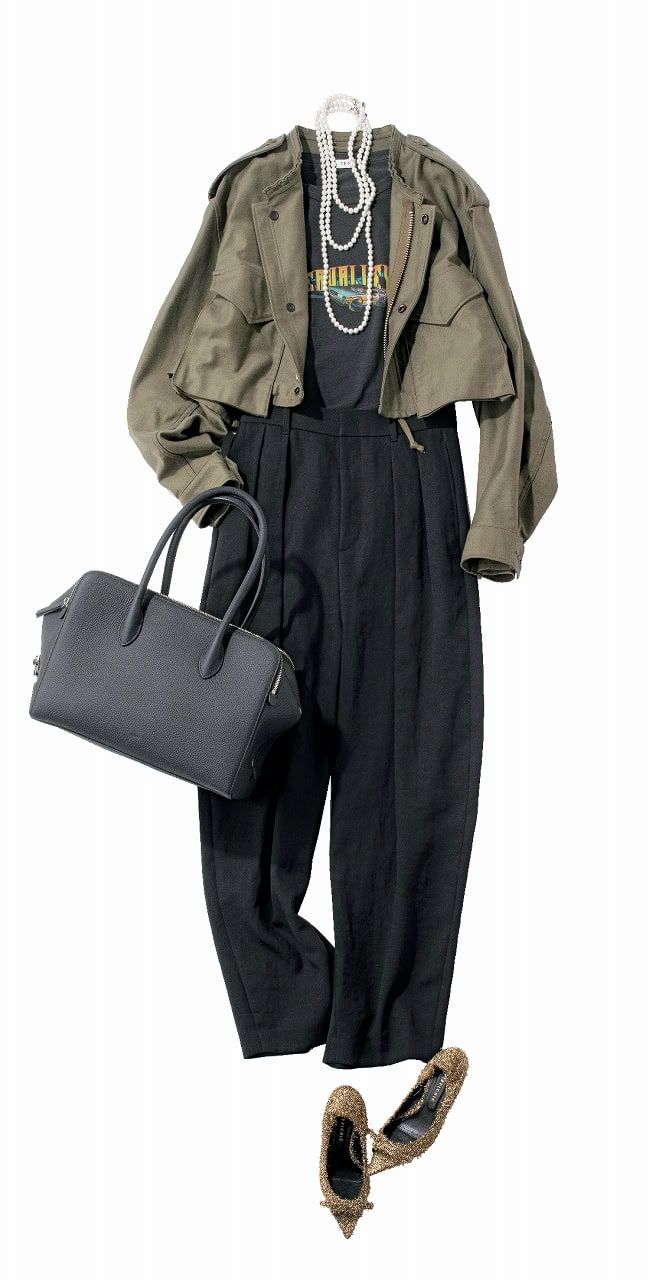 黒Tシャツにカーキジャケットをプラスして、秋らしいシックな表情に。ダボっとした黒パンツと大ぶりアクセが、シンプルながら洗練された大人カジュアルな印象を叶えます。