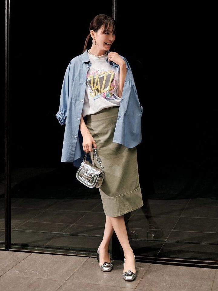 ポップなプリントTをカーキのタイトスカートで大人顔にシフト。ブルーのシャツを軽やかに羽織れば、シンプルなTシャツスタイルに奥行きが生まれます。足元はきれいめで引き締めて、通勤シーンにも映えるコーデに。