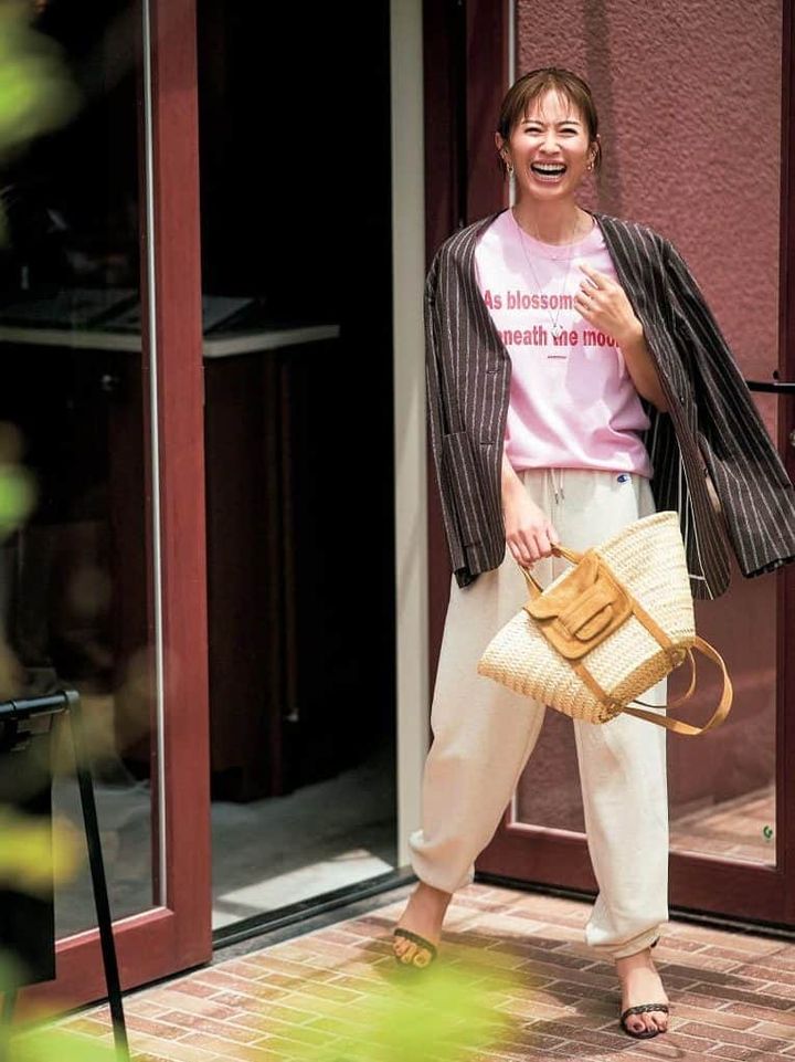 ピンク×ブラウンは秋らしさ満点の組み合わせ。リラックシーなスウェットも、ジャケットを羽織るだけで街仕様に。残暑が気になる日は、足元で抜け感をプラスして。