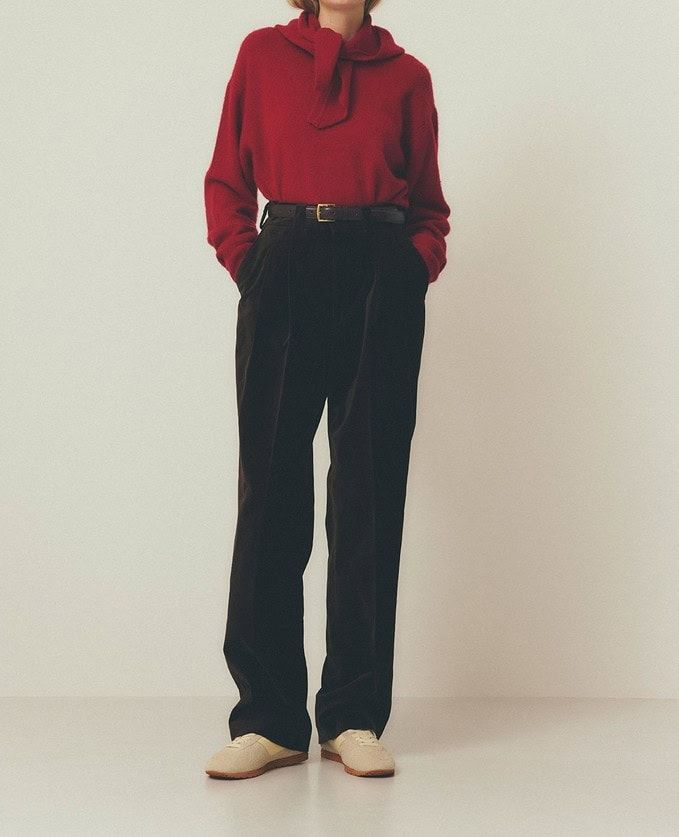 ベーシックなトムボーイパンツも最高オブ最高なのですが、まだお持ちではない方のために説明させていただきますと、ハイウエストのストレートパンツで、程よい落ち感があって、ただ履くだけでこなれたおしゃれ感を出せちゃうスゴイ1本なんです、トムボーイパンツは。名前も可愛いし、覚えてくださいね。オトナミューズ編集部では筆者ももちろんですが編集長も愛用しています。季節に合わせて生地違いでニューモデルが出るのですが、今季はそれが何と女子全員大好きなベルベット♡ 表地にはキメの細かいベルベットが使用されていて、風合いも柔らかくリッチなムードがあるので、いつものスウェットやパーカと合わせても、グッと上品なスタイルに仕上げてくれるんです!