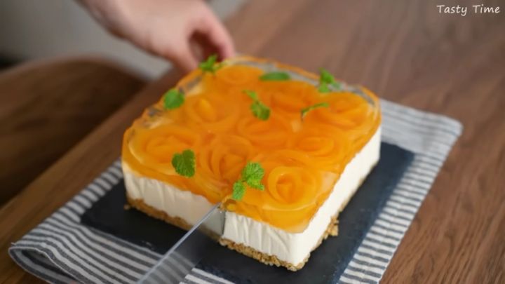 TastyTimeさんは、ピーチシロップ漬けを使ったチーズケーキを作っていました。薄くスライスした果肉をお花の形に整えてチーズケーキの上にのせ、シロップやゼラチンで作ったゼリー液を流し込みます。冷蔵庫でしっかり冷やしたら、美しい桃のチーズケーキの完成!お花の形がくずれないよう、ゼリー液は2回にわけて流し込むのがポイントだそうですよ。