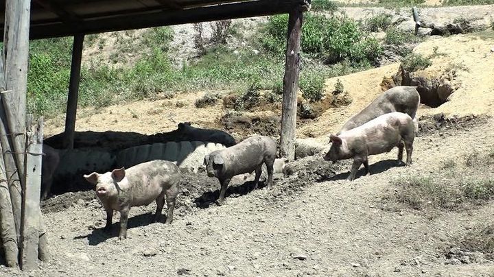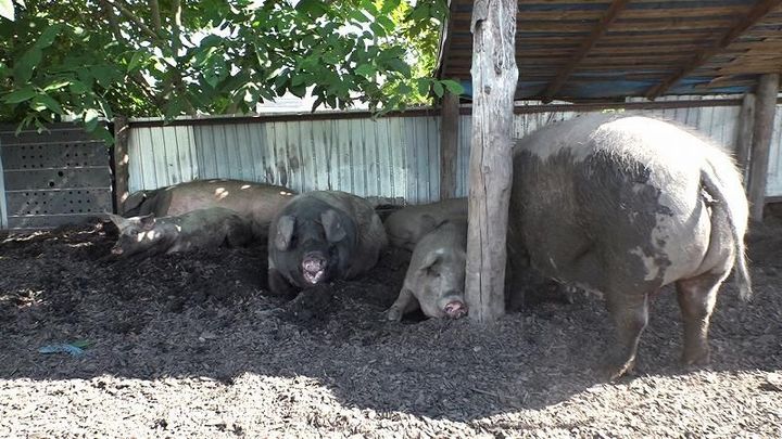 この日は朝から30℃を超えていたため、ブタたちも日陰で休んでいてなかなか起きてきません。
