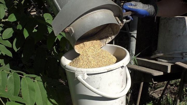 エサはトウモロコシや小麦などを乾燥させて細かくしたもの。