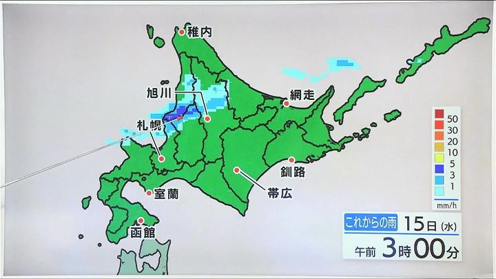 日付が変わって、午前3時頃は旭川周辺で、午前6時頃は札幌周辺でも通り雨があるでしょう。