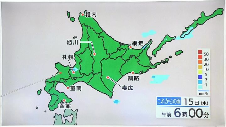 朝はオホーツク海側の海岸部で通り雨がありますが、午後は各地で日が差します。道東の内陸ではあす15日(水)朝も0度くらいまで気温が下がるでしょう。