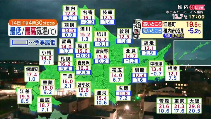 きょう14日(火)の気温を振り返ると、朝は今シーズン一番の寒さで札幌は5.4度、旭川は‐0.1度でこの秋初の氷点下、稚内市沼川は道内の今シーズン最低となる‐5.2度でした。日中は15度前後で、青枠の釧路は日中もこの秋一番肌寒くなりました。最も上がった道南の江差は19.5度でした。