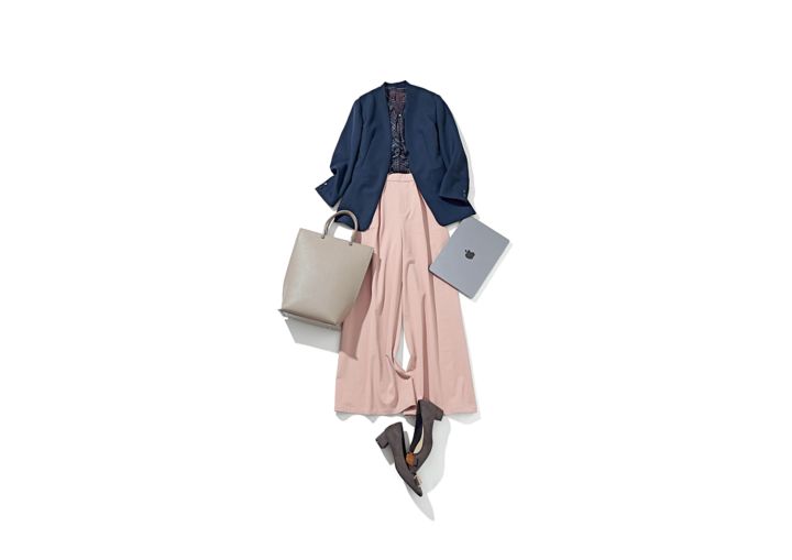 ジャケット¥34,100/ドレスレイブ(ジオン商事) チェックブラウス¥18,700/ジャスグリッティー ピンクワイドパンツ¥23,100/アルページュストーリー スクエアパンプス¥9,900/RANDA トートバッグ¥13,000/PLST