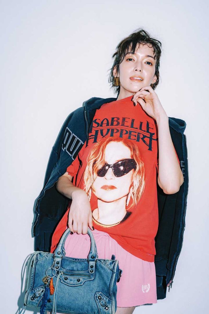 佐藤栞里。ar9月号より Tシャツ ¥126,500、肩にかけたフーディ¥218,900、ミニスカート¥99,000、バッグ¥332,200、チャーム¥136,400、ピアス¥82,500(すべて予定価格)/バレンシアガ(バレンシアガ クライアントサービス)
