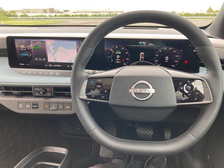 EVだけあって、やはり走りはスムーズの一言。100kmで走行可能な直線コースでグーっとアクセルを踏みましたが、なめらかで静か。いやな振動も感じず、ロードノイズが気になるぐらいでした。低速でも高速でも「ゴツゴツ」した感じはなく、常に優しい乗り味です。日本仕様は欧州仕様とは味付けを変えているそうで、乗り心地、ステアリングの程よい重さなど、運転して終始心地よさを感じました。柔らかな室内の風合いも相まって、欧州仕様が「ずっしり重いパウンドケーキ」ならば、日本仕様は「甘さ抑えた上品な和菓子」の風情でしょうか。