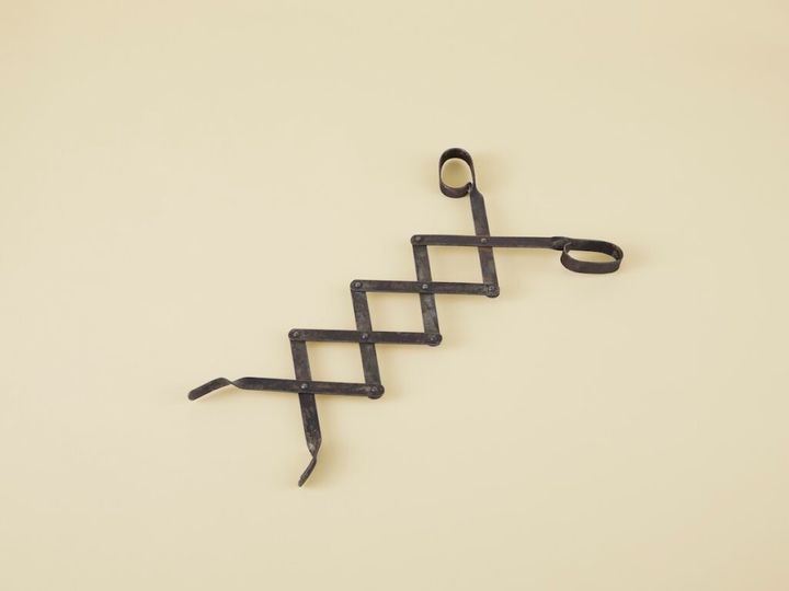 ちょっとコミカルな動きをする伸縮式のトングは、アメリカの古いもの。おそらく暖炉まわりで使うためのものだと思われます。我が家には囲炉裏があるため、炭を掴んで焚べる時に使っています。持ち手を掴むと伸びるという動作も機能的で、熱い火元から距離を取って使えるようになっているのです。鉄製の燭台などもそうですが、火のまわりで使う鉄の道具には、ヨーロッパの製品を彷彿とさせる重厚な魅力を感じますね。