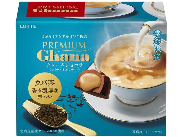 ・世界三大銘茶「ウバ茶」と「北海道産生クリーム」を使用。華やかで香り高い茶葉の風味を感じる、濃厚で上質な一粒に仕上げました。 ・特許を取得したロッテ独自の「セミリキッドショコラ製法*」によって実現した、紅茶と生クリーム入りのとろ~りとしたショコラソースを、ガーナミルクで包み込みました。 *「チョコレートの温度調整や水分を多く含む原料との混ぜ方にこだわった、とろ~り感を長期間保つロッテ独自の製法です。特許第7259147号