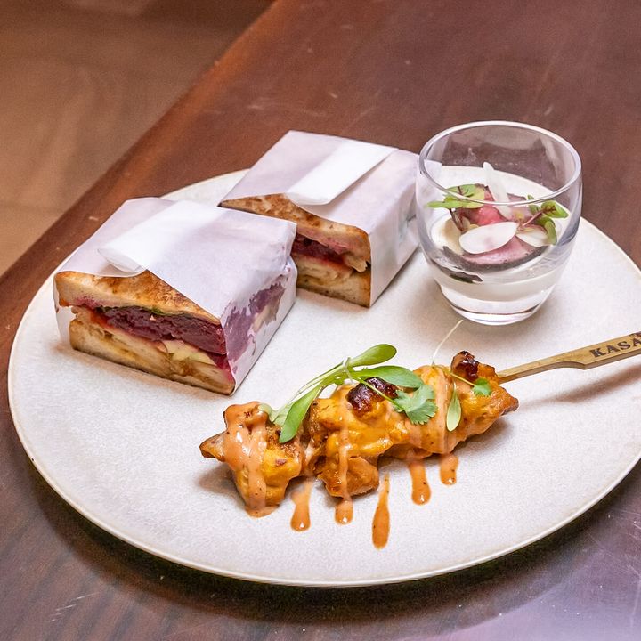 オーストラリアンビーフカルパッチョ アホブランコ、サテーチキン、ベジタリアンサンドイッチ、
