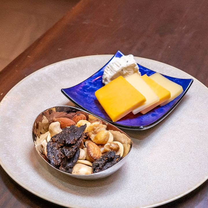 ラムジャーキーとミックスナッツ、チーズ盛り合わせと、夜のひとときを贅沢に過ごせるラインナップ。