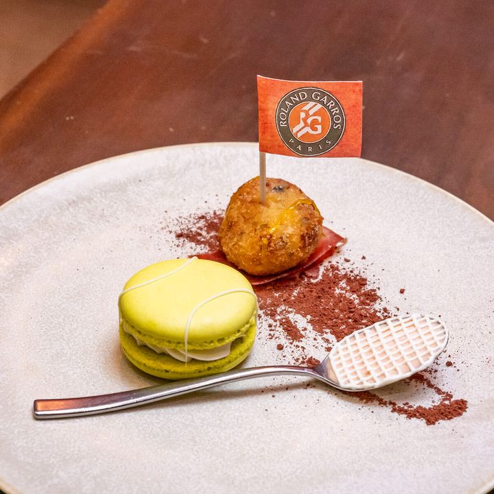 赤土のクロケット、ラケット風サーモンのリエット、テニスボールマカロン、