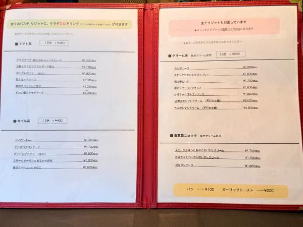 メニューには、トマト・オイル・クリーム系など各5〜7種類のパスタが並び、さらに自家製ニョッキも。