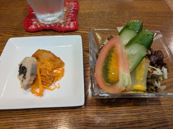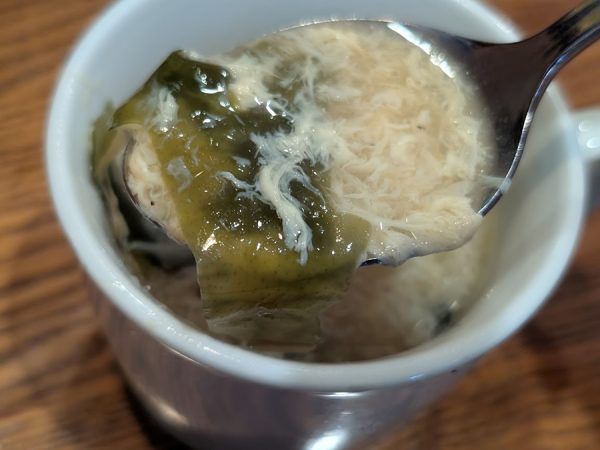 前菜はニンジンのラぺ、ブラバスポテト、紫蘇を巻いた玉子ドーフ。 特に紫蘇を巻いた玉子ドーフはあっさりとしてめっちゃ美味しい★ 玉子とわかめ、ベーコンが入ったスープは最後まで具が楽しめるボリューム。